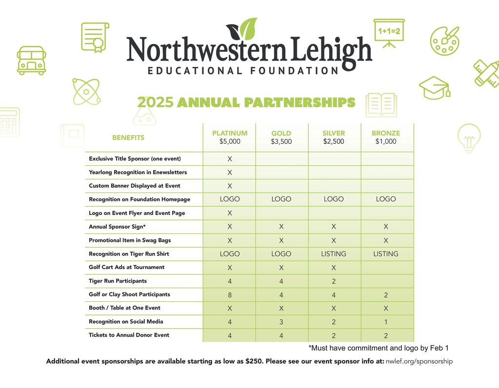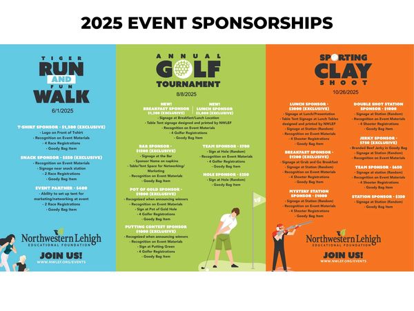 NWLEF is looking for business partners to become annual partner. Now more than ever, these sponsors play a critical role in helping NWLEF meet our annual fundraising goals. In reciprocation of monetary donations, partners and event sponsors receive recognition, advertising and visibility at our events in the Northwestern Lehigh community throughout the year. We have diverse opportunities that should fit every business size and budget.